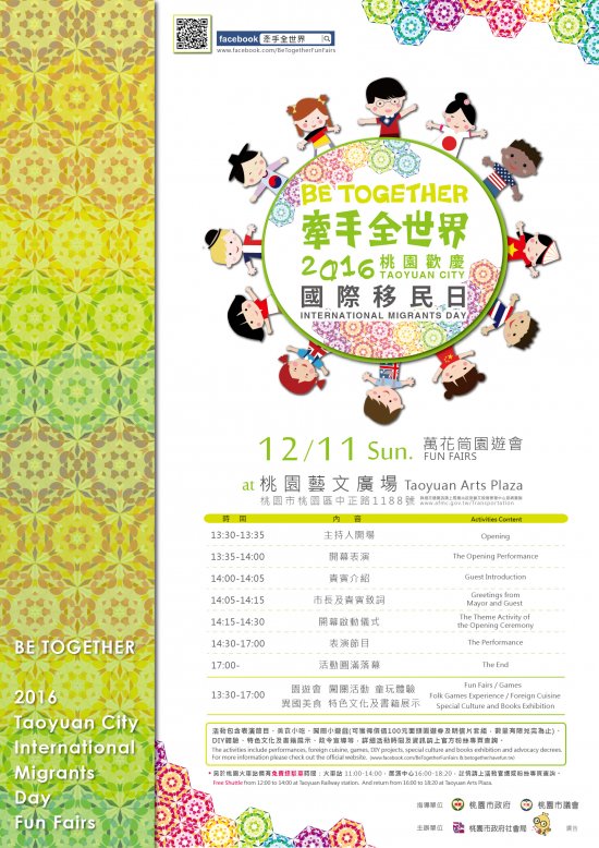 二、為歡慶 105 年國際移民日,本府社會局於 105 年 12 月 11 日(星期日)下午 1 時 30 分假桃園藝文廣場舉辦「2016 桃園歡慶國際移民日-Be together 萬花筒園遊會」,集結多元舞蹈表演、異國美食、童玩、書展、文化及闖關遊戲等攤位,共同炒熱氣氛。