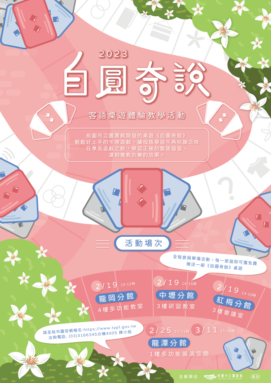 主旨: | 轉知本市立圖書館辦理「自圓奇說」客語桌遊體驗教學活動,請貴校鼓勵親子踴躍報名參加,詳如說明,請查照。 |