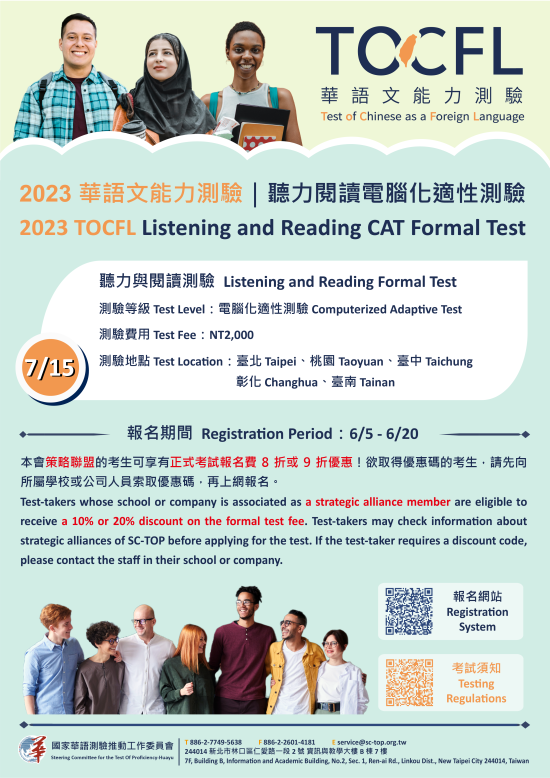 | 主旨: | 轉知國家華語測驗推動工作委員會辦理「華語文能力測驗」112 年 7 月正式考試事宜,請協助公告周知並鼓勵踴躍報考,請查照。 |