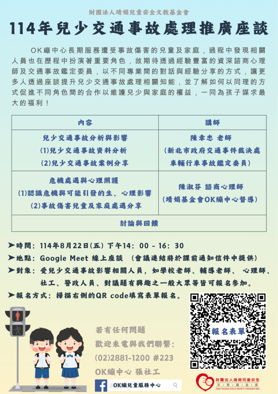 二、 基金會辦理兒少交通事故處理推廣座談,期待透過對話方式從交通、心理、社會等角度分享中心協助處理交通事故的服務經驗傳達給更多相關工作者,讓不同專業之間以同理的態度更了解彼此,一同協助為孩子謀取最大的利益。請貴校踴躍參加。