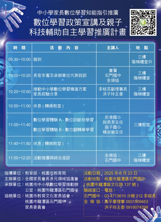 | (一) | 活動名稱:中小學家長數位學習政策宣講及親子科技輔助自主學習推廣計畫。 |