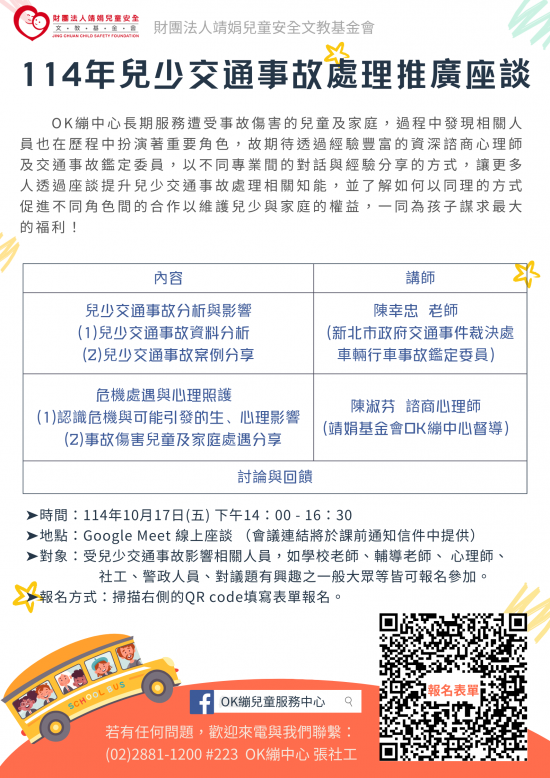 三、 檢附「114 年兒少交通事故處理推廣座談」宣傳單張 1 份。