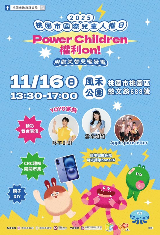 | 三、 | 本次活動以「用歡笑替兒權發電」為主軸,現場規劃「CRC 闖關區」、「Q 萌放電休閒區」、「兒權知能充電區」與「Q 萌手作區」等主題攤位,結合 CRC 概念的設計互動闖關並邀請多組卡司登場與親子互動,亦有豐富精美多項好禮,歡迎踴躍參與。 |